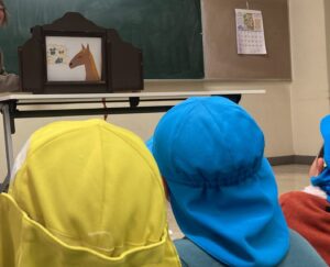 ぺープサートや、紙芝居、絵本の読み語りを聞きました。絵本との関わりの中で、語り手と聞き手のコミュニケーションが生まれた貴重な経験となりました。