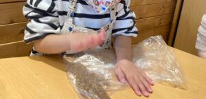 豆の時の匂いときな粉になった粉末の匂いを比べ、「きなこになったね」「きな粉甘そうな匂いだね」と、きな粉好きな子どもたちは、後日おやつ作りの「きな粉おはぎ」に挑戦しました。