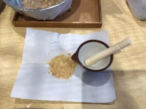 「変身させてみよう」ということで、砕いて擦り棒ですり、豆を炒ってきな粉にしました。