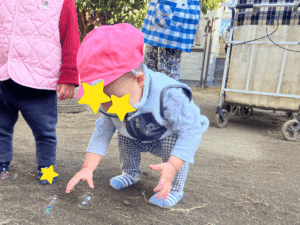 また、地面についたしゃぼん玉を見つけると、地面に顔を近づけてじっと様子を観察していました。