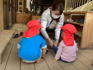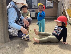 自分のものを探したり、お友だちのものだ。と気付いたり、触ってみたり
