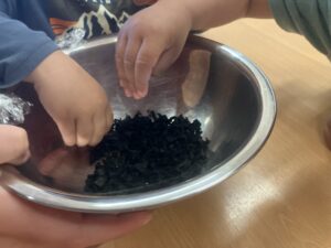 最初は乾燥しているわかめの観察。「かたいね」「パリパリしてるね」と、触って感触を確かめています。
