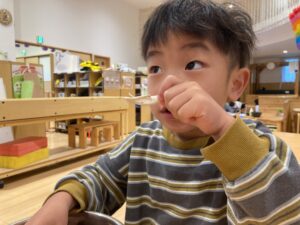 その後は、一本ずつ丁寧にしめじをほぐす作業に挑戦。 力加減を調整しながら ちぎることで、指先の発達にもつながります。