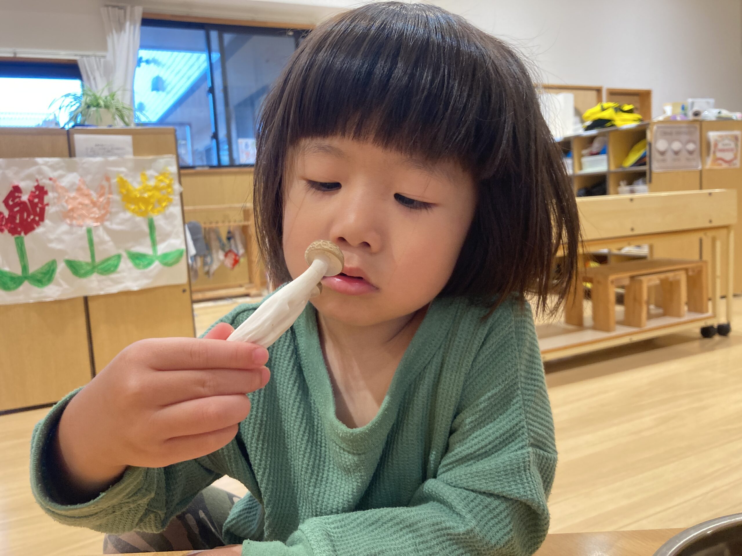 今日は、3~5歳児クラスで行った「しめじ」を使った食育活動の様子をご紹介します。 普段は給食で食べているしめじですが、丸ごと目の前に…