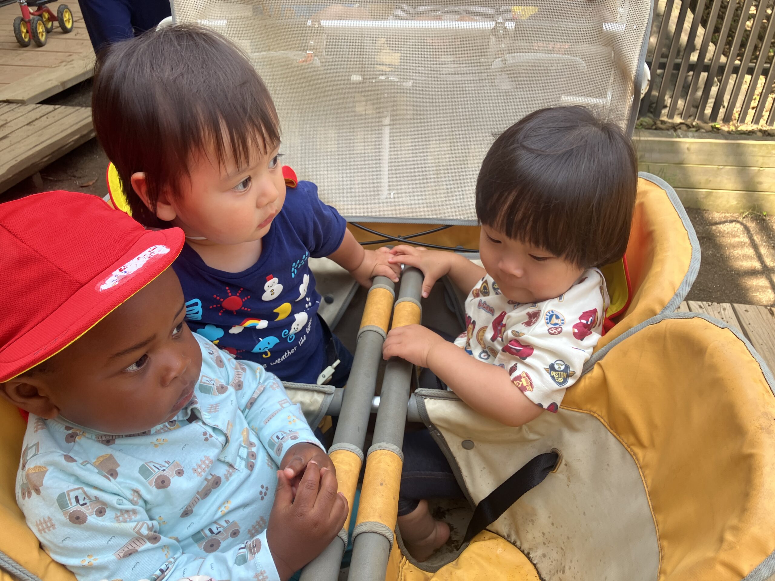 この春、入園したばかりの夢グループのお友だちです。 機嫌よく、葉っぱに手を伸ばしていました。 こうやって、毎日少しずつ園に慣れていき…