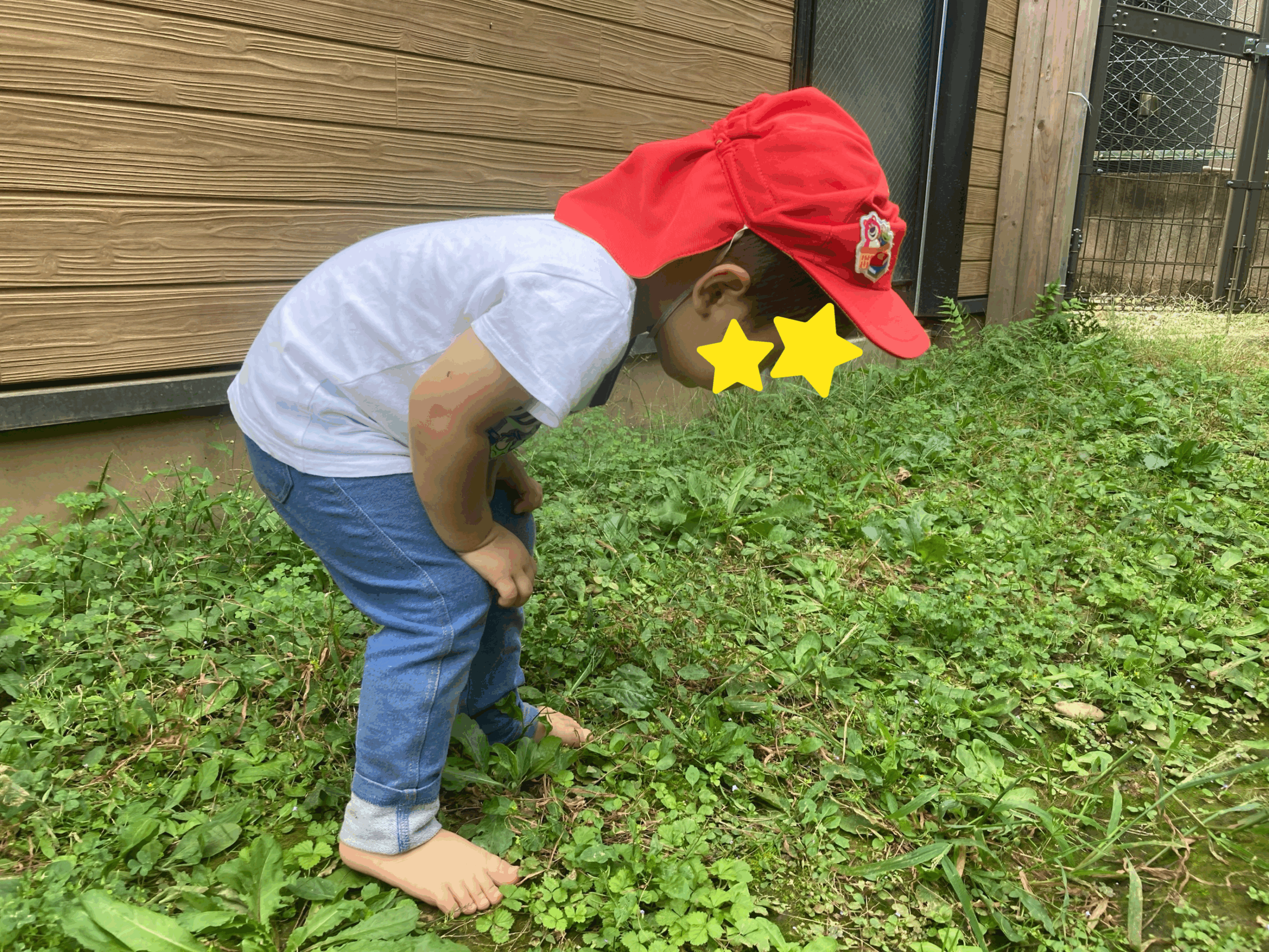 気温が下がり、涼しい風が吹いてきました。 子どもたちは園庭に出て伸び伸びと身体を動かして遊んでいます。 保育者がバッタを見つけたこと…